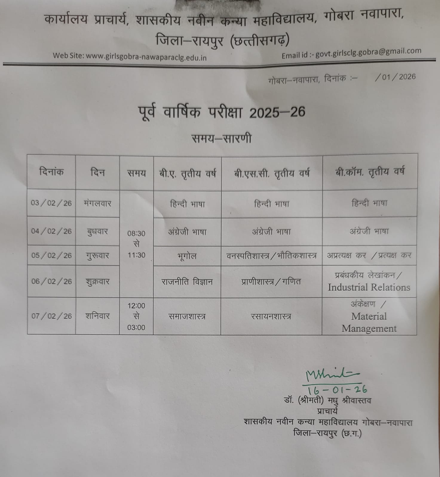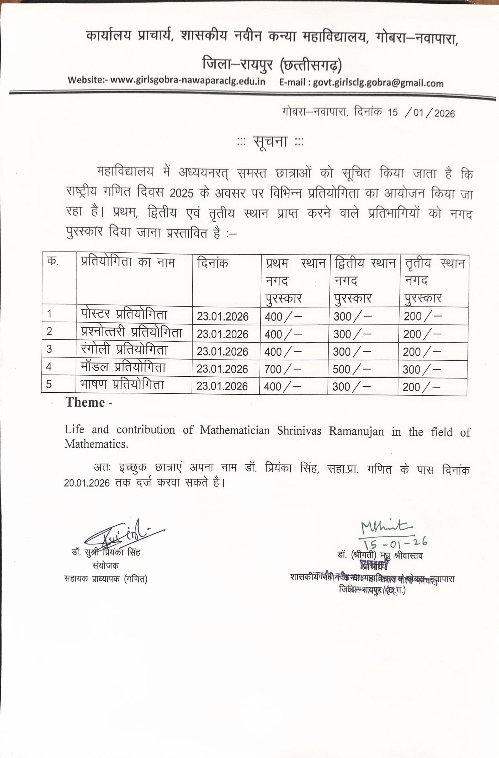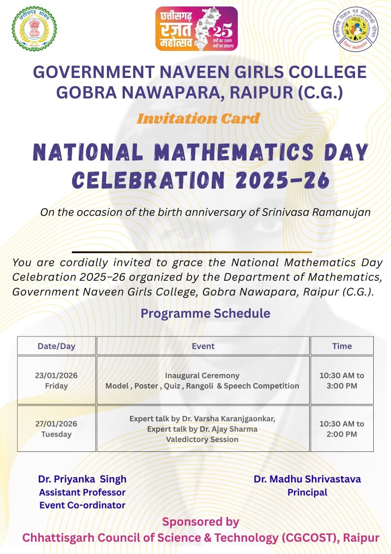 Government Naveen Girls College GobraNawpara wasestablished in the          year 2021.The college is affiliated to the state university Pt. Ravishankar ShulkaUniversity Raipur (C.G.) The college envisions to educate and empower the ruralgirls not only by providing quality education but also by facilitating themwith employability skills and ensuring their holistic development. The collegehas been working towards fulfillment of diverse expectations of young girls inthe field of higher education since its beginning. Teaching is no longer justtransmitting knowledge but it is more of significantly transforming youngminds. Our aim is the holistic development of students through quality educationand enhancing employability by enhancing students with essential skills and knowledge,so that they can efficiently face all challenges in their career and life infuture. With much pride I would like to appreciate our dedicated andresponsible faculty members who are constantly mentoring and motivatingstudents to attain self-confidence and preparing them to succeed in rapidlychanging world. We are confident that the students ofgirl’s college will continue to grow, prosper, reach greater heights and willmake a significant impact on society.