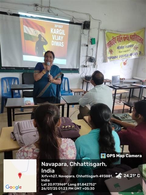 शासकीय नवीन कन्या महाविद्यालय, गोबरा नवापारा में 26 जुलाई को कारगिल विजय दिवस के अवसर पर युवाओं में देशभक्ति और राष्ट्र प्रेम की सर्वोच्च भावनाओं का संचार करने के लिए कार्यक्रम का आयोजन किया गया । डॉक्यूमेंटरी तथा देश प्रेम से सराबोर गीतों को देख व सुनकर छात्राओं में देश सेवा जैसी उच्चतम भावना की लहर देखने को मिली ।