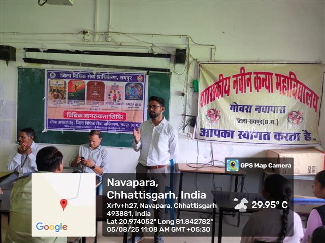 जिला विधिक सेवा प्राधिकरण, रायपुर छत्तीसगढ़ के के तत्वाधान में दिनांक 5 अगस्त 2025 को महाविद्यालय में विधिक जागरूकता शिविर का आयोजन किया गया, इस जागरूकता कार्यक्रम में महाविद्यालय के छात्राओं को विधि से संबंधित अनेक जानकारी प्रदान की गई| जिसमें लोक अदालत, स्थाई अदालत के बारे जानकारी दी गई, साथ ही पास्को एक्ट एवं अन्य जानकारी प्रदान किया गया