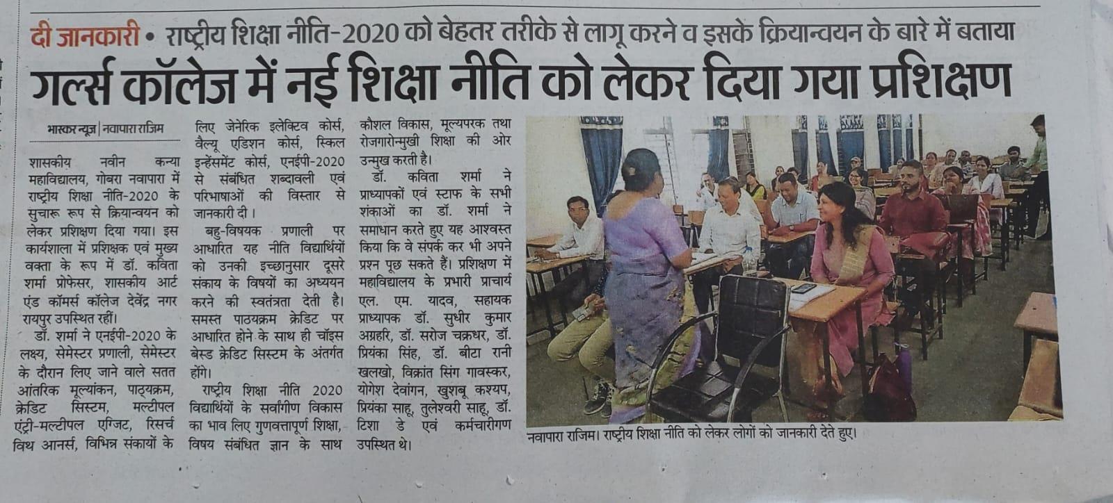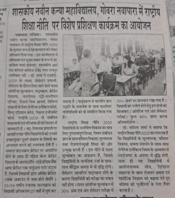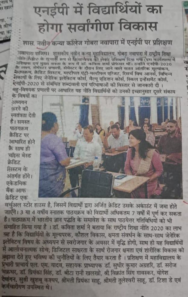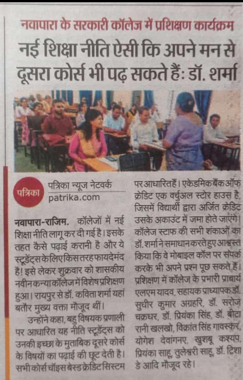 कार्यालय प्राचार्य शासकीय नागार्जुन स्नातकोत्तर विज्ञान महाविद्यालय रायपुर (छ.ग.) (अग्रणी महाविद्यालय), के पत्र क्रमांक 970/1101/2024 रायपुर, दिनांक 29/06/2024 के परिपालन में महाविद्यालय में राष्ट्रीय शिक्षा नीति 2020 के संबंध में दिनांक 05/07/2024 दिन शुक्रवार को प्रशिक्षण आयोजित किया गया है। जिसमें प्रशिक्षण NEP - 2020 मास्टर ट्रेनर डॉ. कविता वर्मा के द्वारा दिया गया।