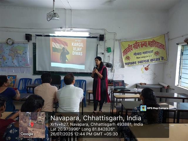 शासकीय नवीन कन्या महाविद्यालय, गोबरा नवापारा में 26 जुलाई को कारगिल विजय दिवस के अवसर पर युवाओं में देशभक्ति और राष्ट्र प्रेम की सर्वोच्च भावनाओं का संचार करने के लिए कार्यक्रम का आयोजन किया गया । डॉक्यूमेंटरी तथा देश प्रेम से सराबोर गीतों को देख व सुनकर छात्राओं में देश सेवा जैसी उच्चतम भावना की लहर देखने को मिली ।